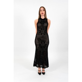Abito lungo in maglia di misto viscosa con lavorazione a rete con motivo a fiori in dégradé. Ha collo tondo e fondo smerlato, sottoveste abbinata, linea fitted.
