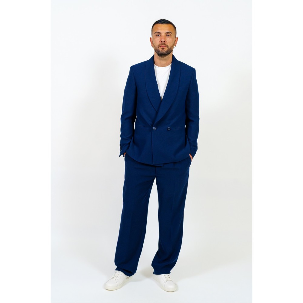Abito uomo doppiopetto tinta unita. Giacca: giacca doppiopetto, vestibilità regular, tasca a filo, rever tondo. Pantalone: Pantalone a palazzo, chiusura con zip e bottone, vestibilità regular. Il modello indossa la tg 50.