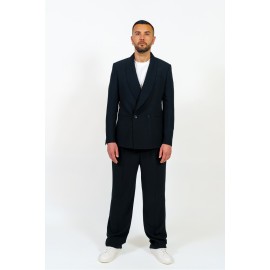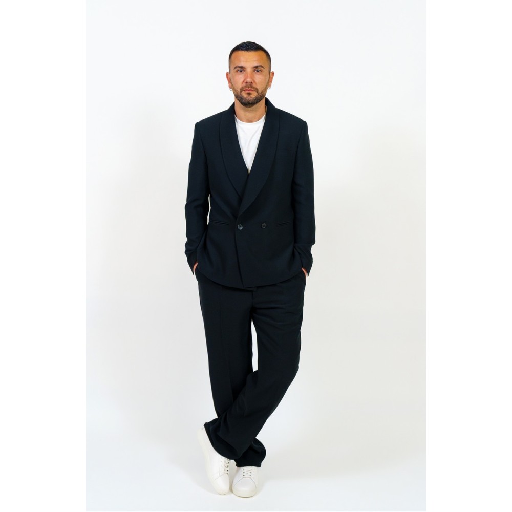 Abito uomo doppiopetto tinta unita. Giacca: giacca doppiopetto, vestibilità regular, tasca a filo, rever tondo. Pantalone: Pantalone a palazzo, chiusura con zip e bottone, vestibilità regular. Il modello indossa la tg 50.
