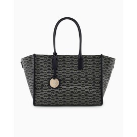 Shopper modello medio provvista di doppio manico, pratica tracolla regolabile in nastro logato e charm logato. Una serie di accessori caratterizzati da una fitta stampa monogram all over e declinati in modelli funzionali pensati per la donna Emporio Armani sempre in movimento.