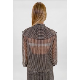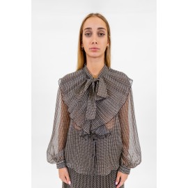 Camicia donna Dixie a fantasia, manica lunga, rouge sul petto e fiocco, vestibilità morbida. La modella indossa la tg S.