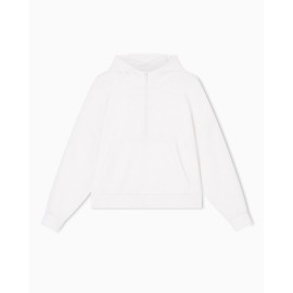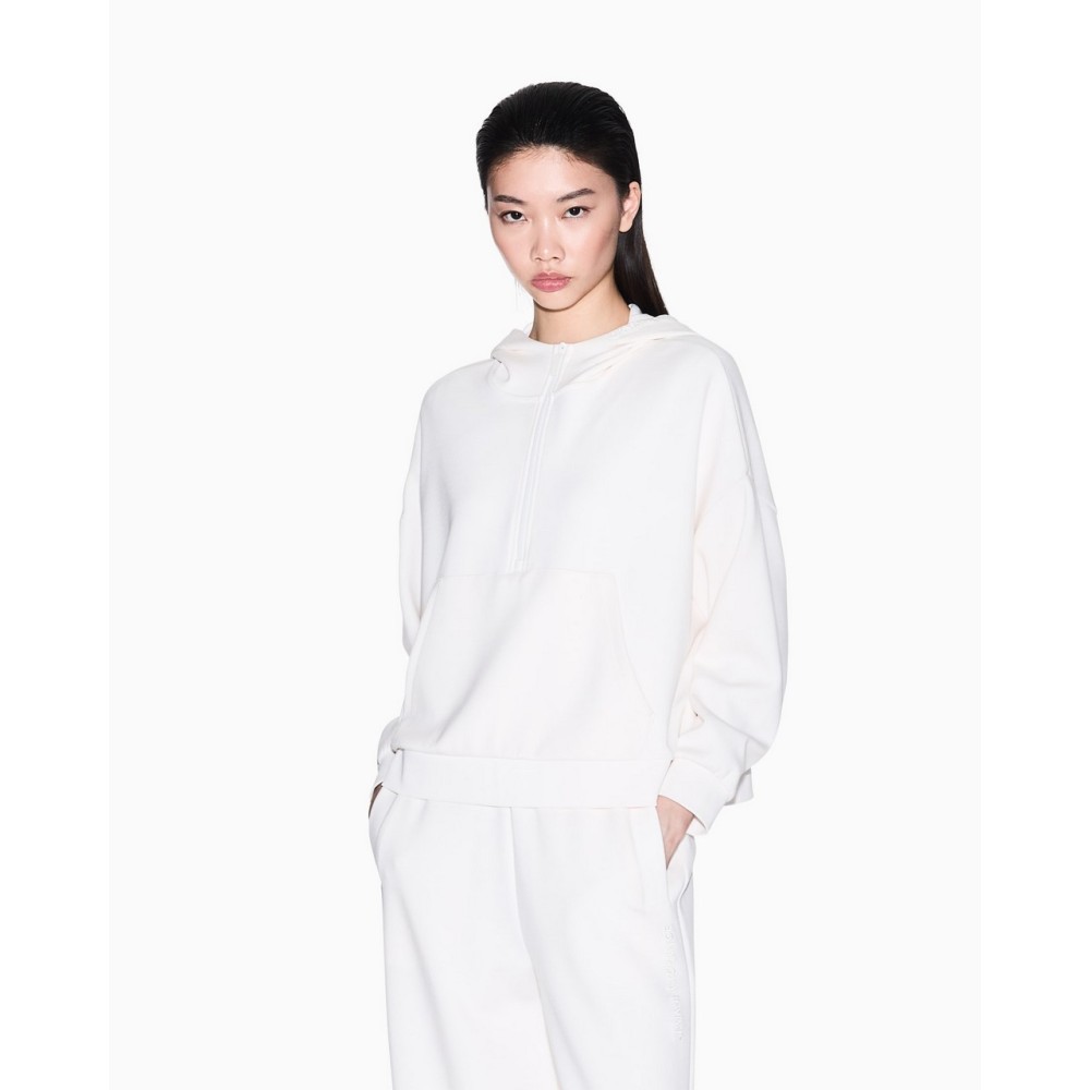 Felpa con cappuccio realizzata in innovativo nylon viscosa stretch, un capo che unisce comfort superiore e design contemporaneo per un look street-style impeccabile. La sua texture morbida e la vestibilità rilassata, con spalle scese, garantiscono una libertà di movimento ideale per affrontare la giornata con dinamismo. La pratica mezza zip frontale e l'ampia tasca a marsupio aggiungono un tocco funzionale e di tendenza, mentre il discreto logo sul cappuccio firma questo pezzo essenziale.