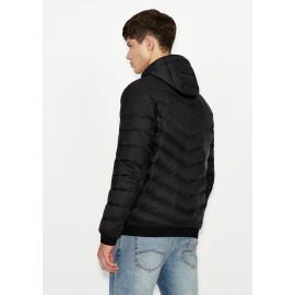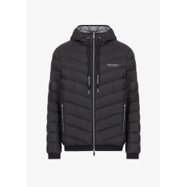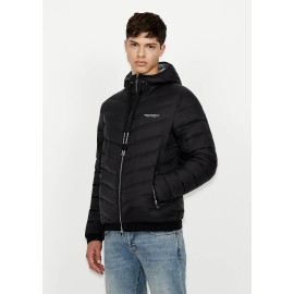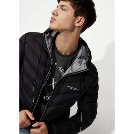 Nylon impunturato e imbottito in vera piuma, per il giubbotto double face con cappuccio richiudibile nel pouch coordinato. Un modello personalizzato dall'elastico che chiude fondo e maniche con scritta logo impressa, perfetto per affrontare i primi freddi improvvisi.