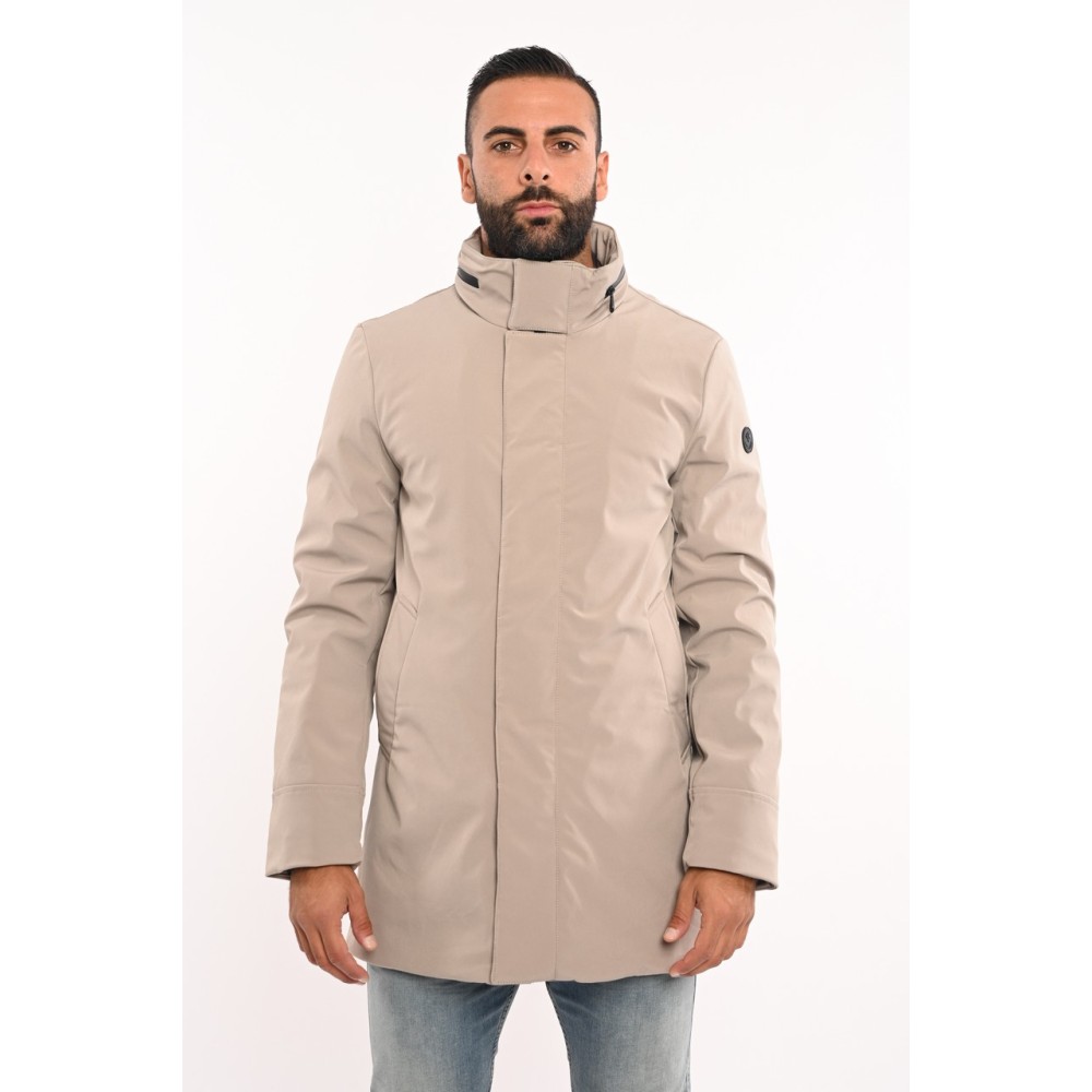 Giubbino uomo Mixture lungo, tinta unita, tasca a filo, bottoni coperti con patta,cappuccio estraibile dal collo.