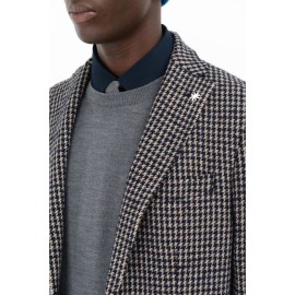 Giacca drop otto semifoderata. Chiusura a due bottoni, due tasche a toppa sul davanti, taschino con pochette removibile, due spacchi sul retro, quattro bottoni ai polsi, lunghezza 72 cm, finiture con impunture AMF. Pied de poule color in misto lana