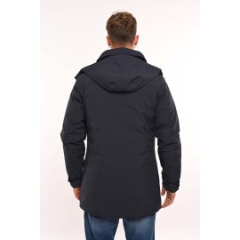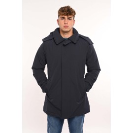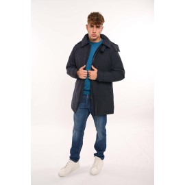 Piumino lungo Save the duck tecnico da uomo con cappuccio staccabile, modello Woody. Chiusura frontale con zip e bottoni, due tasche esterne con chiusura bottone, una tasca interna, imbottitura in plumtech ecosostenibile e traspirante, logo sul braccio, colore testa di moro, trattiene il calore fino ad una temperatura di -5°C.