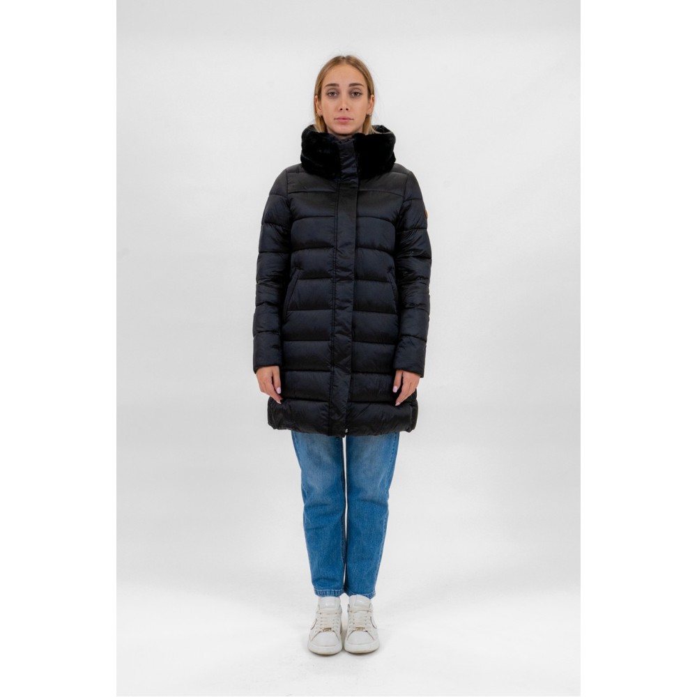 Il piumino Dalea si distingue per la linea ad A e il collo alto in pelliccia sintetica en pendant. Il modello trapuntato e imbottito si chiude con una zip a doppio cursore nascosta da una patta con bottoni per un look pulito e lineare. Il logo tono su tono completa la manica con un inconfondibile dettaglio Save The Duck.