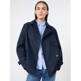 Trench corto in gabardina tecnica antigoccia, caratterizzato da una silhouette svasata con colletto a camicia e maniche a giro con alamari sui polsi. Rifinito con tasche a filettone sui fianchi e spacco centrale sul retro. Chiusura doppiopetto con bottoni. Personalizzato con logo Weekend Max Mara stampato nella fodera interna dello sprone.