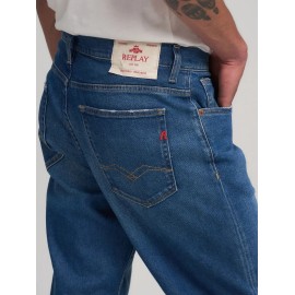 Jeans relaxed fit con vita alta e gamba rilassata dalla coscia al fondo che garantisce una vestibilità morbida e libertà di movimento. Il capo cinque tasche è realizzato in deep blue indigo comfort denim di cotone 11 oz in tono di lavaggio scuro e presenta un trattamento stone wash con ammorbidente finale, baffi e carteggio eseguiti a mano e contrasti sulle zone d'usura. L'iconica cucitura ala di gabbiano caratterizza le tasche posteriori, di cui una è rifinita dal ricamo R, mentre l'etichetta logata sul retro e il piccolo inserto personalizzato su una delle tasche frontali completano il design. Chiusura con bottone e zip.