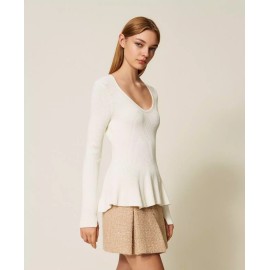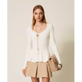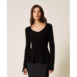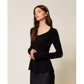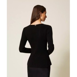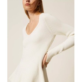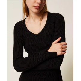 Maglia in misto viscosa con lavorazione a costa inglese, scollatura a V, maniche lunghe a guanto, calature al fondo che creano svasatura, placchetta logo Oval T sul retro.