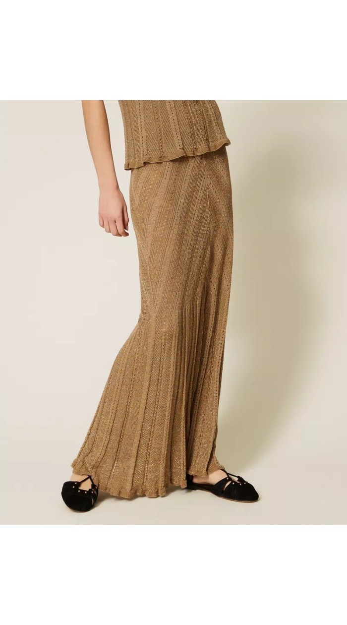 Gonna lunga made in Italy in maglia di misto lino con filato lurex e lavorazione punzonata a disegno chevron che delinea la silhouette.