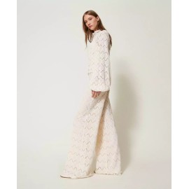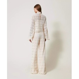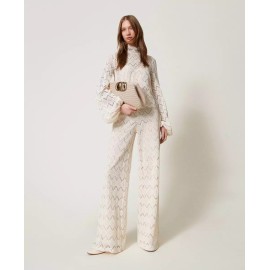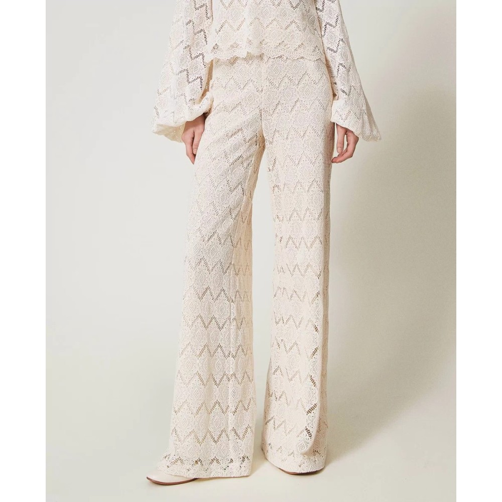 Pantaloni in pizzo macramè con disegno geometrico, vita alta, chiusura con zip al fianco, placchetta logo Oval T sul retro, fodera in mussola di cotone, linea ampia.