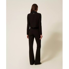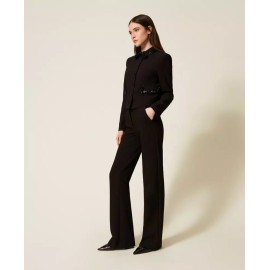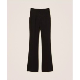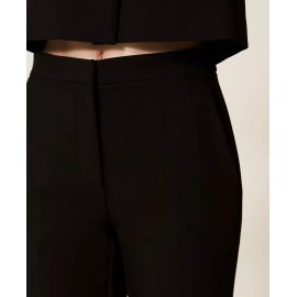 Pantaloni in crêpe di misto viscosa con gancio a uomo e zip, tasche alla francese, placchetta logo Oval T sul retro, linea a palazzo.