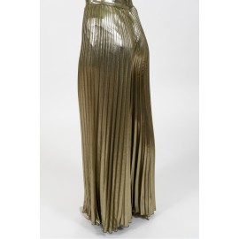 Pantalone donna laminato plissè Dixie di colore oro, a palazzo. La modella indossa la tg S.