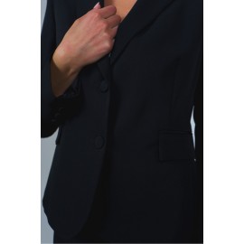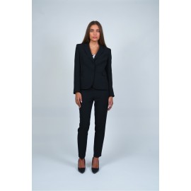 Tailleur donna tinta unita. Giacca: monopetto, bottoni rivestiti, tasca con patta, petto a lancia, vestibilità slim. Pantalone: a sigaretta, chiusura bottone e zip, vita alta.
