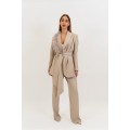 Tailleur donna Elena Casali, fusciacca in vita, dettagli piuma sul rever, vestibilità regular.  Pantalone: Pantalone a zampa, tinta unita, chiusura zip sul lato. La modella indossa la tg 40.