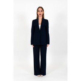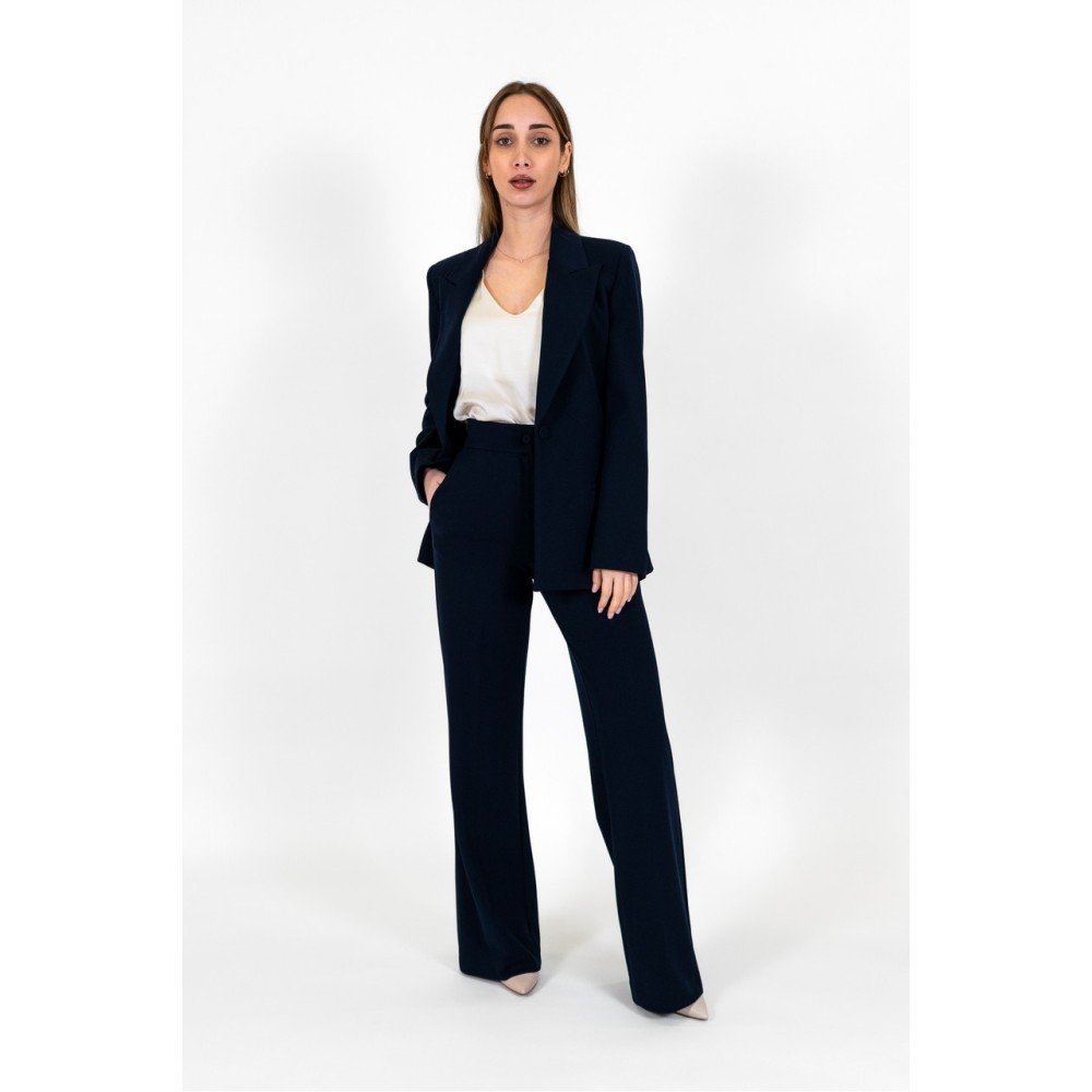 Tailleur donna Dixie tinta unita, giacca monopetto vestibilità slim. Pantalone tinta unita a palazzo, chiusura con zip e bottone. La modella indossa la tg XS.