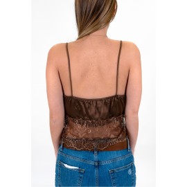 Top donna Haveone tinta unita in raso con pizzo. Spallina sottile, possibile applicazione di manicotto in raso. La modella indossa la tg XS.